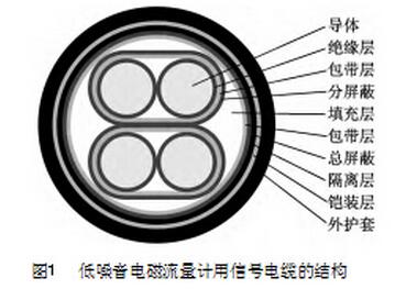 在石油化工、冶金、食品飲料、制藥、造紙、染料等眾多領(lǐng)域,通常采用污水處理流量計(jì)對(duì)流動(dòng)的各種混濁、懸浮液體介質(zhì)(水煤漿、泥漿污水、水泥混凝土漿、紙漿、金屬流體等)的流量進(jìn)行測(cè)量。污水處理流量計(jì)用信號(hào)電纜主要用于將污水處理流量計(jì)的實(shí)際測(cè)量結(jié)果信號(hào)傳輸至顯示系統(tǒng)。隨著污水處理流量計(jì)測(cè)量系統(tǒng)中電路的日趨復(fù)雜和對(duì)信號(hào)傳輸要求的逐步提高,傳統(tǒng)污水處理流量計(jì)用信號(hào)電纜的性能已無(wú)法滿足使用要求,因此本公司開展了一種新型低噪音污水處理流量計(jì)用信號(hào)電纜的研制。