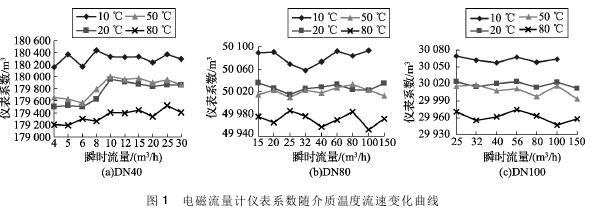 將實驗測得的耐腐蝕排污管道流量計在不同溫度及流速下的儀表系數數據整理,特性曲線如圖1所示,3組曲線分別對應DN40、DN80、DN100的3塊耐腐蝕排污管道流量計的儀表系數曲線。