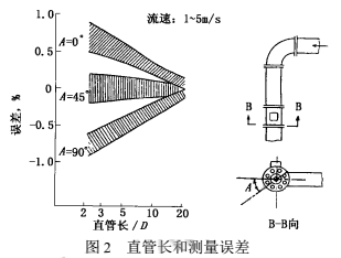 流體流過彎管后,下游產生流速分布畸變,若是兩只鄰近相接的不同平面彎管,除流速分布畸變外還會有漩渦。這些現象要影響裝在下游的大部分類型流量儀表(除容積式等少數類型外)的測量值,因此通常要求在流量儀表安裝點之前有一定長度直管段,改善進入儀表的流動狀況。智能硫酸流量計受彎管影響較小,直管長度要求也遠低于節流差壓式、渦街式等其他流量儀表。但是當前智能硫酸流量計精度為測量值的0.5%,甚至0.2%~0.4%,即使影響量較小,還是受到人們的關注。