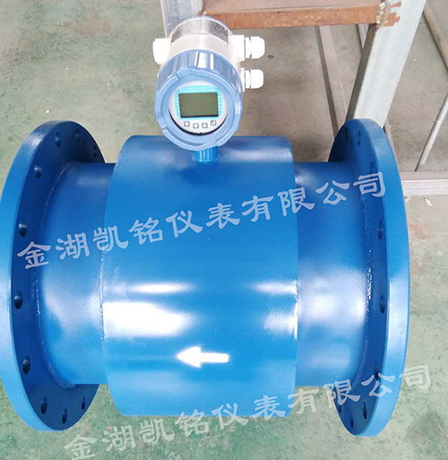 凱銘電磁流量計是以內(nèi)襯絕緣材料做為非導(dǎo)磁合金短管;兩只電極沿管徑方向穿通壁固定在測量管上,其電極頭與襯里內(nèi)表面基本齊平。勵磁線圈由雙向方波脈沖勱磁時,將在與測量管軸線垂直的方向上產(chǎn)生一磁通量密度為B的工作磁場;此時,如果具有一定電導(dǎo)率的液體流經(jīng)測量管,將切割磁力線感應(yīng)出電動勢E,電動勢E正比于磁通量密度B,測量管內(nèi)徑d與平均流速V 的乘積。電動勢E(流量信號)由電極檢出并通過電纜送至轉(zhuǎn)換器。轉(zhuǎn)換器將流量信號放大處理后,可顯示流體流量,并能輸出脈沖,摸擬電流等信號,用于流量的控制和調(diào)節(jié)。