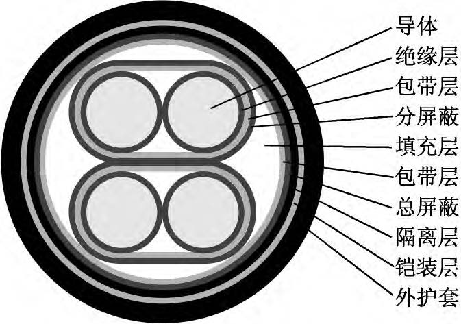 該新型電纜的結構如圖1所示。導體為單股退火鍍錫軟銅線,以提高導體的導電性和防腐蝕性。在導體外繞包一層薄F4(聚四氟乙烯)半導電帶,有利于降低導體和絕緣之間的摩擦起電噪音。絕緣采用材料較為純凈、介電常數(shù)較小、具有一定彈性的聚丙烯絕緣級材料,并采用擠壓式擠出,減小絕緣層與導體的間隙。采用對絞組作為信號傳輸線,由于在兩根傳輸線上感應的電壓接近相等,減小了電壓差值,提高了信號傳輸穩(wěn)定性;對絞組由兩種不同顏色絕緣線芯組成,相鄰線對對絞節(jié)距應不大于100mm。對絞分屏蔽組(即對對絞組進行分屏蔽,每對對絞組外繞包兩層聚酯帶和一層厚0.04mm鋁塑復合帶繞包,內(nèi)置一根7×0.26mm鍍錫銅絞線作引流線)有利于對不同對絞組之間信號串音的抑制和隔離。對絞分屏蔽組同心式絞合成纜,在對絞分屏蔽組間填充非吸濕性材料,以保證纜芯圓整。在成纜纜芯外繞包兩層聚酯帶,再采用鋁塑復合帶繞包,內(nèi)置鍍錫銅線作引流線,以提高電纜電磁屏蔽能力。總屏蔽層外擠包隔離層(隔離護套),隔離層采用絕緣級低密度聚乙烯材料。隔離層外采用鎧裝層,鎧裝材料為高導磁合金鋼帶,其為強磁材料,可將外來的磁通大部分限制在鎧裝層的外表面上(僅有少部分能進入被屏蔽的空間);鎧裝時對高導磁合金鋼帶采用縱包焊接,確保其形成一連續(xù)圓柱管;鎧裝層可提高電纜抗電磁干擾水平以及對電纜進行加強,減少電纜振動引起的電動勢。外護套采用藍色軟PVC(聚氯乙烯)護層級電纜材料擠包,實現(xiàn)電纜防護。