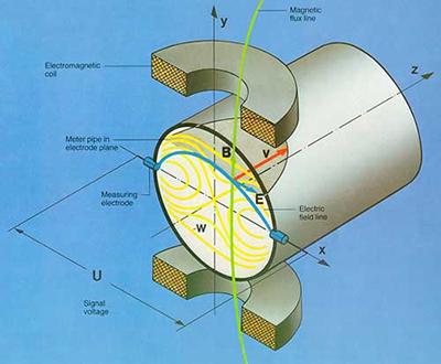 電磁流量計的工作原理是基于法拉*電磁感應(yīng)定律。在測量管內(nèi)的導(dǎo)電介質(zhì)相當于法拉*試驗中的導(dǎo)電金屬桿,上下兩端的兩個電磁線圈產(chǎn)生恒定磁場。當有導(dǎo)電介質(zhì)流過時,則會產(chǎn)生感應(yīng)電壓。管道內(nèi)部的兩個電極測量產(chǎn)生的感應(yīng)電壓。
