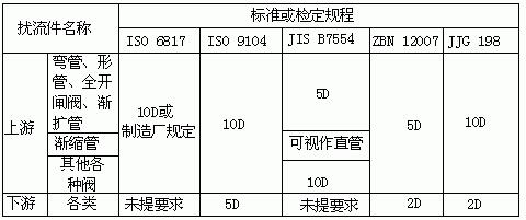 為獲得正常測量精確度,電磁流量傳感器上游也要有一定長度直管段,但其長度與大部分其它流量儀表相比要求較低。90°彎管、T形管、同心異徑管、全開閘閥后通常認為只要離電極中心線(不是傳感器進口端連接面)5倍直徑(5D)長度的直管段,不同開度的閥則需10D;下游直管段為(2~3)D或無要求;但要防止蝶閥閥片伸入到傳感器測量管內(nèi)。各標準或檢定規(guī)程所提出上下游直管段長度亦不一致,匯集如表1所示,要求比通常要求高,這是由于為保證達到當前0.5級精度儀表的要求。表1