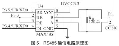 RS485接口組成半雙工網(wǎng)絡(luò),選擇兩線制與上位機(jī)電腦相連,采用屏蔽雙絞線傳輸。通信系統(tǒng)整體為總線式結(jié)構(gòu),這樣1臺上位機(jī)*多可以和現(xiàn)場32臺智能儀表相連。采用MAX485芯片完成電壓轉(zhuǎn)換,圖5為RS485通信電路原理圖。