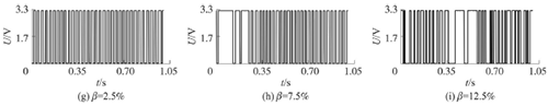 試驗(yàn)發(fā)現(xiàn),氣相的加入對(duì)過(guò)熱蒸汽流量計(jì)測(cè)量的影響顯著,譜分析和脈沖計(jì)數(shù)兩種方法隨著氣相注入的增加其表現(xiàn)也不同。圖4反映了水流量12m3/h時(shí),注入不同氣含率β時(shí)A點(diǎn)的模擬信號(hào),如圖4(a~c)所示;經(jīng)譜分析后得到的頻率值,如圖4(d~f)所示;用脈沖計(jì)數(shù)方法得到的脈沖信號(hào),如圖4(g~i)所示。圖4顯示,當(dāng)注入氣量不大時(shí),對(duì)過(guò)熱蒸汽流量計(jì)的影響不大,無(wú)論是譜分析結(jié)果還是脈沖計(jì)數(shù)得到的結(jié)果都比較好。當(dāng)注入的氣量進(jìn)一步增加時(shí),渦街原始信號(hào)強(qiáng)度和穩(wěn)定性逐漸變差,渦街頻率信號(hào)會(huì)被干擾信號(hào)所淹沒(méi),反映到譜分析圖是,渦街頻率的譜能量減小,干擾信號(hào)的譜能量加強(qiáng);對(duì)于脈沖信號(hào),會(huì)因?yàn)橐恍┬郎u信號(hào)減弱,形成脈沖缺失現(xiàn)象,而不能真實(shí)地反映渦街產(chǎn)生的頻率。