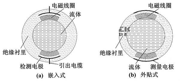 電極與被測(cè)流體通過絕緣管形成檢測(cè)電容,通過此電容來藕合流量信號(hào)。其主要的結(jié)構(gòu)形式按照電極的安裝位置可以分為兩種:電極嵌人測(cè)量管的絕緣襯里內(nèi)部(嵌人式)、電極貼在測(cè)量管外部(外貼式)。嵌入式結(jié)構(gòu)與普通工業(yè)污水流量計(jì)結(jié)構(gòu)相似,而外貼式大多是通過陶瓷表面金屬化技術(shù)將電極貼在測(cè)量管外。