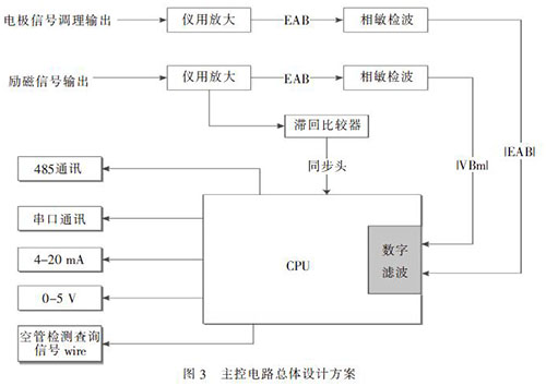 電極檢測出的微弱感應(yīng)電動(dòng)勢E, 先經(jīng)前置放大器的放大和噪聲抑制而成為大幅度低阻抗的電壓信號(hào)。此信號(hào)經(jīng)相敏檢波后,給CPU 進(jìn)行數(shù)字濾波、處理和控制,通過利用雙線性變換法將模擬的二階巴特沃斯低通濾波器轉(zhuǎn)換為數(shù)字式濾波器,既簡化電路設(shè)計(jì),且可靠性高、穩(wěn)定性好。通過編寫軟件CPU 能對(duì)放大器的溫度漂移及零點(diǎn)漂移給予補(bǔ)償, 并在測量的全量程范圍內(nèi)分10 段對(duì)信號(hào)進(jìn)行非線性修正,使得測量值更好地?cái)M合真實(shí)數(shù)據(jù)。空管檢測電路上,CPU 作為從控制器。當(dāng)主控制電路上發(fā)出空管檢測查詢信號(hào)wire, 從控制器進(jìn)行識(shí)別后接收并判斷出查詢什么信號(hào),然后產(chǎn)生應(yīng)答信號(hào)上傳至主控芯片輸出顯示;當(dāng)檢測為空管信號(hào)時(shí), 從CPU 發(fā)出的zero 信號(hào)通過控制MOS 管開關(guān)來關(guān)斷流速輸出。在應(yīng)用中,對(duì)于微弱信號(hào)的放大及提取還需注意PCB 板設(shè)計(jì)時(shí)EMI 電磁屏蔽考慮,屏蔽來自空間磁場的干擾、周邊設(shè)備的輻射造成的干擾和板內(nèi)之間的干擾,如數(shù)模分離、強(qiáng)弱電分離等等。