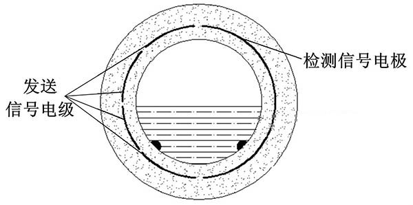 ③利用阻抗或信號(hào)衰減研制的非滿管管道式電磁流量計(jì)。這種結(jié)構(gòu)的非滿管管道式電磁流量計(jì)是當(dāng)前國(guó)內(nèi)研究的方向之一。其結(jié)構(gòu)是流量管底部貼一對(duì)信號(hào)發(fā)射電極,在流量管中間貼信號(hào)接收電極。由于信號(hào)在流體中傳播會(huì)產(chǎn)生衰減,且傳播時(shí)間越長(zhǎng),衰減越多,因此通過(guò)信號(hào)接收電極接收到的信號(hào)衰減量即可得知液面高度;同時(shí)該電極還能測(cè)量流體切割磁感線產(chǎn)生的電動(dòng)勢(shì),以此達(dá)到測(cè)量非滿管流量的目的。阻抗式或信號(hào)衰減非滿管管道式電磁流量計(jì)結(jié)構(gòu)簡(jiǎn)圖如圖5所示。