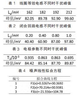 仿真試驗(yàn)中,設(shè)定線(xiàn)圈等效電感取值范圍為 162~212mH,間隔 10mH;閉合回路等效電感范圍 0.2~1mH,間隔為 0.2mH;雙電層電容、接觸電阻隨流體電導(dǎo)率變化而變化,電導(dǎo)率增大接觸電阻和雙電層電容減小而電荷傳遞電阻增大。可設(shè)定電極接觸電阻、雙電層電容和電荷傳遞電阻范圍分別為 5~15kΩ、10~20μF 和50~60Ω,由公式(7)知,可用 T2 表示上述三者關(guān)系。 仿真參數(shù)取值不同情況下,通過(guò) MATLAB 工具箱對(duì)仿真測(cè)量得到的干擾峰值進(jìn)行曲線(xiàn)擬合畫(huà)出相應(yīng)的曲線(xiàn)圖。 其中仿真數(shù)據(jù)和相對(duì)應(yīng)的曲線(xiàn)方程如表 1~表 4 所示,曲線(xiàn)圖如圖 4~圖 6。