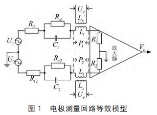 測(cè)量電極與流體介質(zhì)接觸時(shí)會(huì)發(fā)生電化學(xué)反應(yīng)在電極-溶液界面形成阻抗,通常由法拉*阻抗與雙電層電容并聯(lián)組成。 法拉*過(guò)程分為電荷傳遞過(guò)程和擴(kuò)散過(guò)程,相應(yīng)的法拉*阻抗由電荷傳遞電阻與擴(kuò)散阻抗串聯(lián)組成。一般硫酸鐵流量計(jì)的勵(lì)磁頻率大于1Hz,而擴(kuò)散阻抗發(fā)生在更低頻率內(nèi),不考慮擴(kuò)散過(guò)程,電極等效阻抗為電荷傳遞電阻與雙電層電容并聯(lián)后再與電極接觸電阻串聯(lián)。 基于電極阻抗建立的電極等效測(cè)量回路如圖 1 所示。圖中:Rs1 和 Rs2 為電荷傳遞電阻;C1 和 C2 為雙電層電容;Rt為兩個(gè)測(cè)量電極間的接觸電阻滿(mǎn)足 Rt=Rt1+Rt2;Lx 為勵(lì)磁線(xiàn)圈等效電感;L1 為閉合回路等效電感;R1 和 R2 為放大器輸入電阻;P1和 P2 為由“變壓器效應(yīng)”疊加在測(cè)量電極上的微分干擾;U1 為流體切割磁力線(xiàn)產(chǎn)生的感應(yīng)電勢(shì);Ue 為勵(lì)磁電壓。 假設(shè)磁感應(yīng)強(qiáng)度由勵(lì)磁電流決定且成正比關(guān)系即 B=aI,忽略串模等干擾則電極間電壓為感應(yīng)電勢(shì)與微分干擾的疊加,基本方程如下:
