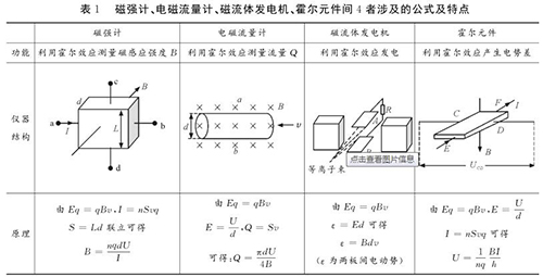 易錯點2:磁強計、印染污水流量計、磁流體發(fā)電機、霍爾元件間的區(qū)別與聯(lián)系磁強計、印染污水流量計、磁流體發(fā)電機、霍爾元件都是利用電磁場對帶電粒子的偏轉(zhuǎn)效應(yīng),并且穩(wěn)定時電場力與磁場力均達到平衡。很多學(xué)生容易將其混淆,遇到問題常常搞不清原理,亂代公式,筆者特將4者涉及的公式及特點等做一對比區(qū)別如表1所示。