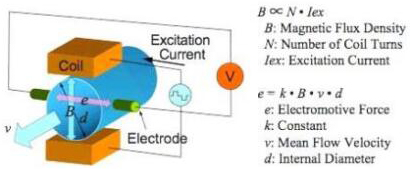 使用一體式電磁流量計(jì)測(cè)量的液體流量必須導(dǎo)電是非常重要的。法拉*定律表明,信號(hào)電壓(E)取決于平均液體速度(V),導(dǎo)體的長(zhǎng)度(D)和磁場(chǎng)強(qiáng)度(B)。因此,將在管的橫截面中建立磁場(chǎng)。