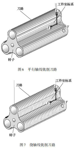 三葉轉(zhuǎn)子的曲面是由多條直線組成的直紋面,加工三葉轉(zhuǎn)子這種高精度的直紋曲面必須采用四軸或五軸聯(lián)動的數(shù)控機床。三葉轉(zhuǎn)子的銑削方式有刀具路徑平行軸線銑削、繞軸線銑削兩種刀具路徑。平行軸線銑削原理為: 刀具在轉(zhuǎn)子曲面上沿 X軸從轉(zhuǎn)子的一端移動到另一端銑出一條直線,銑削下一點位時旋轉(zhuǎn) A 軸 Z 軸聯(lián)動再次從轉(zhuǎn)子一端銑削到另一端,采用往復銑削直到完成整個轉(zhuǎn)子曲面,刀具路徑如圖 6 所示。繞軸線銑削原理為: 刀具在轉(zhuǎn)子曲面上 AZ 軸聯(lián)動刀具繞 A 軸軸線銑削,銑削下一點位時移動 X 軸,再次 AZ 軸進行聯(lián)動銑削,采用往復銑削直到完成整個轉(zhuǎn)子曲面,刀具路徑如圖 7 所示。由于繞軸銑削需要 AZ 軸聯(lián)動切削,而數(shù)控機床可以達到的進給率是由*慢的軸決定的,所以,這種刀具路徑在精加工高速銑削時并不適用。