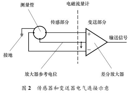 智能型防腐電磁流量計(jì)主要由兩部分組成:流量傳感器和信號變送器,如圖 2 所示。傳感器上的勵磁線圈接受變送器傳輸來的勵磁電流產(chǎn)生磁場,輸出感應(yīng)電動勢信號;信號變送器則將感應(yīng)電動勢信號轉(zhuǎn)換為流量信號或模擬量信號送至控制系統(tǒng)。智能型防腐電磁流量計(jì)按組成方式分為一體式和分體式。智能型防腐電磁流量計(jì)穩(wěn)定工作另外一個重要條件是接地。當(dāng)流體流動穿過磁場時,以導(dǎo)電流體本身作為參考電位,在測量管一側(cè)電極產(chǎn)生正電勢,另一側(cè)產(chǎn)生負(fù)電勢,形成電勢差。但此電動勢信號一般只有幾毫伏,易受外界干擾。為防止干擾,將參考電位接入大地作為零電位,保證傳感器輸出精確穩(wěn)定的信號。傳感器和轉(zhuǎn)換器的接地端必須與被測介質(zhì)同電位,才能構(gòu)成對稱的輸入輸出回路。