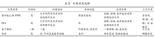 智能型防腐電磁流量計(jì)要根據(jù)被測流體的溫度、壓力、速度以及含固顆粒的硬度、含量和粒徑大小來決定測量管內(nèi)襯的材質(zhì)。該濕法磷酸裝置中,智能型防腐電磁流量計(jì)測量管襯里材質(zhì)的種類見表 2。