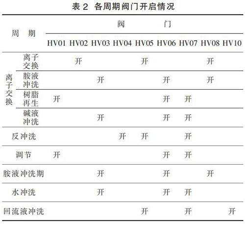 5)回流沖洗周期。 胺液每天都需取樣化驗(yàn),如果發(fā)現(xiàn)胺液中有不溶或懸浮的過渡金屬聚集,則每天運(yùn)行周期結(jié)束后需利用回流液對樹脂進(jìn)行清洗,以防止腐蝕和樹脂損壞。 如果選擇了此選項(xiàng),PLC程序會(huì)在每天完成目標(biāo)數(shù)量的離子交換周期后,自動(dòng)執(zhí)行回流液清洗周期。 各周期閥門對應(yīng)開關(guān)情況,如表 2 所示。