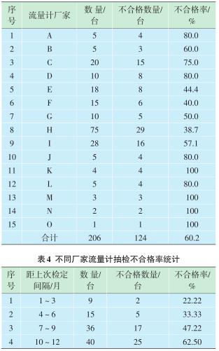2018年選取100臺氣體流量計按照其檢定后的使用時間進行了統計,其不合格率統計見表4。從表4中可以看出,5個月之后流量計的使用誤差出現較大偏差,檢定不合格率明顯增加。