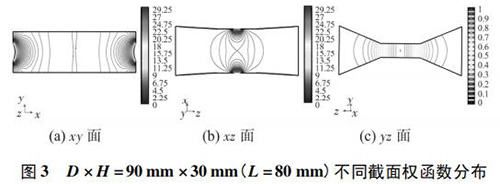 4) 圖 3( c) 、圖 4( c) 的 yz 面權函數分布表明,D = 90 mm時的權函數等勢線間距略大于 D = 60 mm 時的權函數等勢線間距,權函數變化梯度較小,且中心區域的權函數等勢線逐漸變為直線,因此 D = 90 mm 的權函數分布更均勻一些,但是兩者區別很小,即寬度改變對 yz 面權函數分布影響很小。圖 4( c) 、圖 5( c) 的 yz 面權函數分布表明,H = 30 mm時的權函數等勢線間距較大,且中心區域的權函數等勢線逐漸變為直線,因此 H = 30 mm 的權函數分布更加均勻;