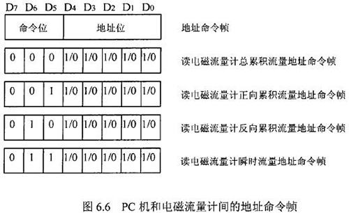 由于RS一485電氣標準規定每段只能聯結犯個節點設備,因此可用地址幀中五個二進制位表示這32個地址,其余3位用來表示命令,從而構成地址命令幀。對于控制命令需求不超過八個的通信系統,采用地址命令幀可壓縮報文長度提高通信效率。在污水網絡監控系統中,飲用水流量計和PC機通信的主要目的是將流量計中的有用數據讀到PC機中。這些數據包括:總累積流量、正向累積流量、反向累積流量、瞬時流量。通信時,PC機只需向飲用水流量計發送讀總累積流量、讀正向累積流量、讀反向累積流量、讀瞬時流量命令即可,因此二者間通信所用的地址幀和命令幀可合二為一,用一個地址命令幀代替。PC機和飲用水流量計間的地址命令幀定義如圖.66所示。根據污水網絡監控系統中PC機與飲用水流量計間通信的特殊性,二者通信所使用的報文可簡化為圖.67的格式。