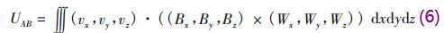 式中j→為電流密度矢量,為通過液體單位面積的電流,A/m2;E→為電場強度矢量,V/m;v→為流體速度,m/s;B→為磁感應(yīng)強度,T。當激勵電流角頻率ω不大時,流體中的位移電流完全可以忽略,即