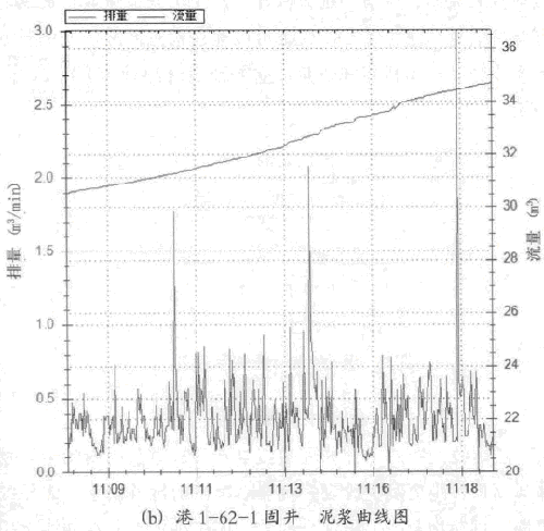 在固井全程的曲線中,也可以發現開始固井的時候.泥漿排量雜波較小,究其原因是剛開始固并時,泥漿管線剛泄壓,管線中還是充滿了液體,雖然振動強度雷同.但是葉片有阻尼,振幅較小.對其影響也較小。例如曲線圖的11;03: 00-11: 03: 53之間的泥漿排量沒有雜波。在港1-62-1固井過程中,水泥漿打了413澎,結果本應該是0的泥漿,卻走數了23.0 m',其影響可謂巨大.并非通過普通的濾波或切除所能排除,必須執行一個特殊算法。