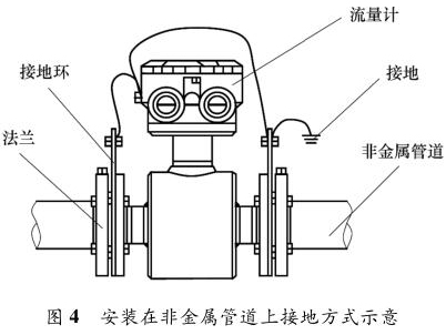 乙醇管道流量計安裝在金屬管道上,安裝時將金屬管道與乙醇管道流量計相連接,接地線再接入接地網,如圖 3 所示。