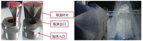 圖 1 為電弧風(fēng)扇噴嘴的結(jié)構(gòu)和噴霧,一種新型的噴嘴主要由一個(gè)過(guò)熱蒸汽渦街流量計(jì)入口、出口和導(dǎo)流葉片組成。出流口的圓柱形設(shè)計(jì)降低了湍流強(qiáng)度。導(dǎo)流葉片類似于流線型尾部,產(chǎn)生類似于弧形風(fēng)扇形狀的過(guò)熱蒸汽渦街流量計(jì)噴霧,其形狀類似于掘進(jìn)機(jī)的粉塵源。