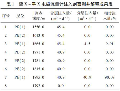 2017 年 9 月在大慶油田采油八廠肇 X - 平 X 水平井注水井中*次進行了水平井注入剖面測井現場試驗。該井斜深2 055. 42 m,水平段長度為568. 46 m,試驗目的是通過注入剖面測井了解該井各層段的注水情況,同時對水平井測井工藝、儀器的適用性、井下牽引器及井口輔助裝置等設備的工作有效性和可靠性進行評價?,F場試驗中,在密閉條件下錄取到了該井的注入剖面測井資料,進行了重復測量,重復測量結果在誤差允許范圍內,測井成果見表 1。該井施工壓力 6. 0 MPa,注入量45. 4 m3 /d,有 7 個射孔層,分 8 個測點測量,2 個層有吸入顯示,其中,P13( 1) ( 1 734 ~ 1 767 m) 層絕對吸入量4. 5 m3 /d,相對吸入量為9. 91 %,P13( 1) ( 1 899 ~1 943 m)層絕對吸入量 40. 9 m3 /d,相對吸入量為 90. 09% ,測井成果見表 1。通過與甲方的交流,再結合該井的動靜態資料及周圍井的工作狀況,采油廠的地質人員認為本次測井結果能比較準確地反映該井的注入情況。