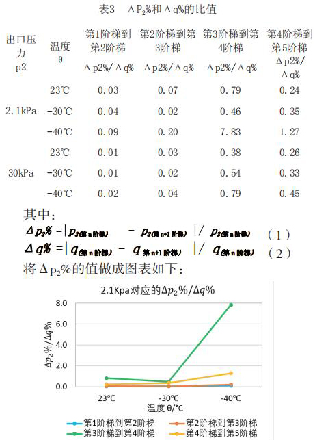 為了更直觀嚴謹的對比每個階段響應速度的不同,對原始數據進行處理,得到如下表格2和表格3。將△p2%/△q%作為響應速度的直觀量化表達,若△p2%/△q%的值大,說明單位流量變化照成的出口壓力變化大,即說明分體式電磁流量計響應相對較慢,反之亦然。
