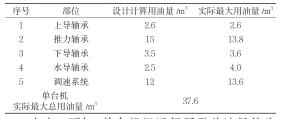 由表1可知,單臺(tái)機(jī)組運(yùn)行所需總油量約為37.6m3,其中各軸承所需油量約為24m3,均超出設(shè)計(jì)計(jì)算總油量。機(jī)組運(yùn)行所需總油量超出一個(gè)運(yùn)行油桶的總?cè)莘e,至少需用2個(gè)油桶來盛放。為保證機(jī)組各軸承用油和調(diào)速系統(tǒng)用油的油品質(zhì)量,機(jī)組排油時(shí)將各軸承所用透平油(約為24m3)排至一個(gè)運(yùn)行油桶中,將調(diào)速系統(tǒng)所用透平油(約為13.6m3)排至另一個(gè)運(yùn)行油桶中,避免混合造成油質(zhì)化驗(yàn)指標(biāo)不滿足用油設(shè)備的要求。