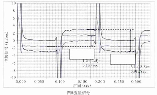 舉例,如圖5所示,線圈采用5Hz驅動時的0feet/s,3.1feet/s,5.9feet/s流速下的電極信號,利用上述方法對信號進行處理并計算流速。取每半波*后的20%納入流速計算,正半波與負半波相減即是流速。如3.1feet/s–(-2.8feet/s)=5.9feet/s,雖然有+0.15 feet/s的直流偏置,但也不影響流速的計算。因線圈是5Hz驅動,半波的20%是20ms,正好是1個完整的工頻周期,這樣就不受工頻干擾的影響。正半波與負半波相減,這樣就避免了直流偏置和共模干擾的影響。再加上在數(shù)字濾波過程中使用限幅濾波和算數(shù)平均,保證了流量信號的有效提取。