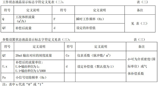工作狀態液晶顯示標志字符定義見表(二):