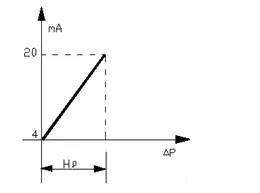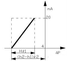 以電動差壓變送器為例,當液位H為O時,差壓變送器輸出的信號應為4 mA,當液位H為*高液位時,差壓變送器輸出的信號應為20 mA,這是一種比較理想狀態。從圖1可見,當被測介質的密度為ρ,容器中液體以上部分的氣相并不會凝結成冷凝液,這時作用于變送器正負壓室的差壓應為:△Р= Hρ。其曲線如圖2所示:
