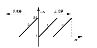 差壓變送器的零點遷移量分為正遷移與負遷移,在液位零點位置,當正負壓室之間的壓差值P>0時,為正遷移;P<0時,為負遷移;P=0時,無遷移。差壓變送器正負遷移特性曲線表示如下,見圖3: