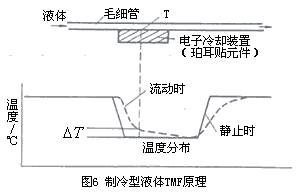 液體用tmf 在20世紀90年代初中期開始發展并在工業生產中應用,但當前主要為微小流量儀表。有消耗功率測量法的熱分布式tmf和利用珀爾帖( peltier)致冷元件在檢測部位致冷(即附加熱)的tmf。后者的測量原理如圖6所示,流量傳感器由測量毛細管、電子冷卻裝置(珀爾帖元件)和3各溫度檢出件組成。測量管和致冷元件接觸,無液體流動時冷卻到某一溫度時,兩者溫度相等;液體流動時致冷元件附近測量毛細管溫度上升,如虛線所示分布,測量溫度檢測點的兩者溫度差以求的流量。